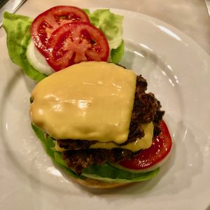 One of the debits of cooking for one is that no one in the food industry thinks anyone does this. So the inevitable left-overs too often go bad before the solitary cook can use them. Not so with the portobello leftover from yesterday’s burger. Put into the food processor and pulse until the pieces approximate the size of the chopped meat, it’s a perfect earthy addition to a beef patty. As I am an inveterate cheese lover, mine was topped with coarsely grated cheddar and some caramelized mushrooms I had on hand. You can use any toppings you wish. And I think lettuce makes any burger look better.