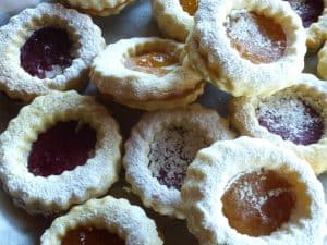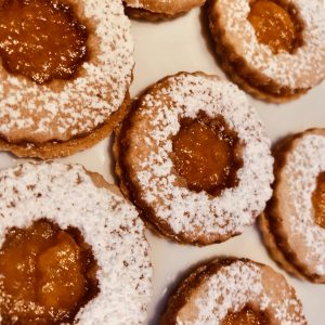 Despite all indications to the contrary, Dorie Greenspan’s cookie recipes are not all that Andrew bakes. But as we recently pointed out, as you’re going through “Dorie’s Cookies”(Houghton Mifflin Harcourt 2016) and you’ve only gotten to page 242 of its 517, there’s a lot of material to cover. In this case, it’s a miniature riff on a Linzer torte. The jam sandwich of cookies is from Austria and named after the town of Linz. From over the border in Southern Germany comes the Spitzbuben. This cookie too is jam-filled but what separates them from their Austrian cousins is that they’re made from walnuts and just a pinch of cinnamon. What shines through in the pastry is butter, sugar, and nuts. The dough is baked first—half forming perfect little disks. The other half are given cut-outs. The sandwich is made later and that’s when the jam comes in.