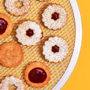 A delightful walnut butter cookie is sandwiched with luscious jam.