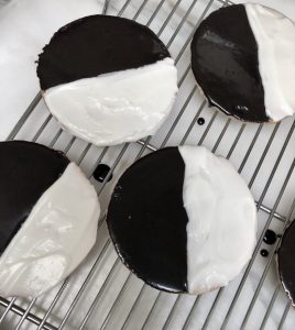 Unlike most recipes that are claimed by multiple chefs, the Black and White is traced exclusively to Glaser’s Bake Shop in Yorkville on the Upper East Side. Owned by Bavarian immigrants, it opened in 1902. Yorkville was then a German enclave. Before it became the posh place it is now, it was a middle-to-working-class neighborhood. While there were Czechs, Slovaks, Irish, Polish, and Hungarians living there, the Germans predominated as did German foods. John and Justine Glaser’s recipe dates from the very opening of their Bake Shop and it was their original recipe, one of many created by the Glasers. The Black and White has close cousins—like the Half-Moon cookie baked in Utica, NY. That cookie dates from 1925. So the Glasers get full credit for its invention. Sadly, after 116 years, Glaser’s closed for good in 2018. The Black and White lives on. It even found its way back to Germany by way of American GIs in the 1950s. There it was called the Amerikaner although it’s most often only iced in white.