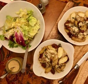 Over the holidays, I was intrigued to see Raclette, the superb melting cheese from Switzerland, at Trader Joe’s. I thought about making Fondue but lost custody of my Fondue pot in a long-ago divorce. Andrew and I never replaced it.  Then Ina Garten’s “Modern Comfort Food” (Clarkson Potter 2020) arrived with an irresistible recipe called Baked Raclette.  A seasonal item long gone from Trader Joe’s, I was excited to find Raclette at Whole Foods. Once home, I made Ina’s winning recipe. Fingerling potatoes are first boiled, then steamed.  They join fresh Spanish Chorizo sausages that have been browned, a little wine, salt, and pepper in gratin dishes. The Raclette is sliced and arranged in one layer over the potatoes and Chorizo. Thyme sprigs complete the dish which is baked until the cheese is hot and bubbly. Served with a great baguette, Dijon mustard, and a green salad, this truly is: Modern Comfort Food.